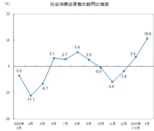 本站获得最新消息,国家统计局数据显示,3月份,社会消费品零售总额37855亿元,同比增长10.6%。