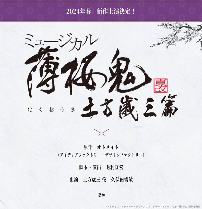音乐剧 "薄樱鬼真的变了"土方岁三篇做个决定吧!2024年4月开业。