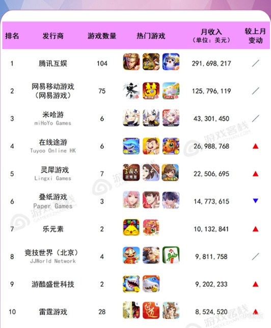 七麦数据显示,根据游戏驿站显示,3月国内游戏发行商iOS收入预估榜单中,腾讯、网易、米哈游稳居前三,其中腾讯互娱预估月收入为2.91亿美元(折合人民币约21.1亿元);网易移动游戏月收入预计为1.25亿美元(折合人民币约9.09亿元);Miha的月收入估计为4330万美元(折合人民币约3.13亿元)。下图显示了该榜单的前十名: